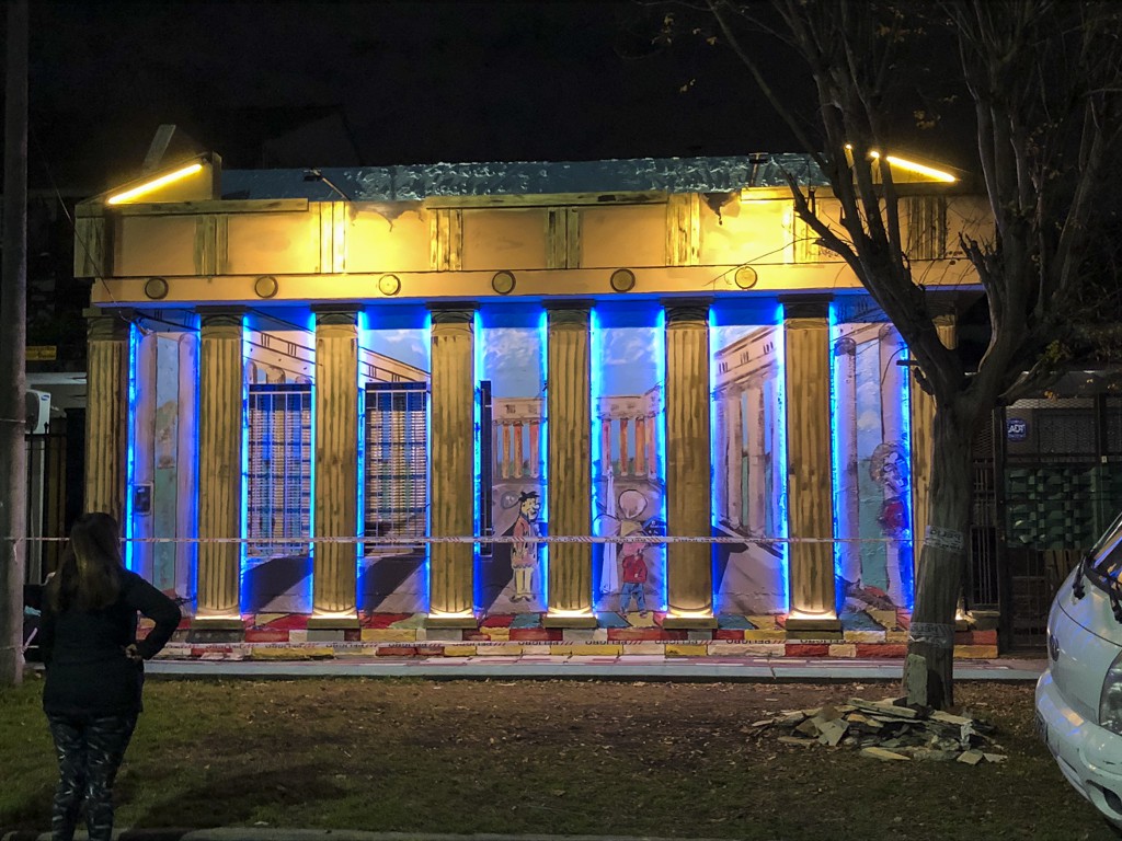 Se trata de una obra tridimensional proyectada en el lateral de una casa ubicada sobre la calle Colonia a metros de Uribe en la que se aprecia, con efecto de perspectiva y profundidad, las columnas que identifican al Partenón original. Además, como detalle que distingue a las obras de Rubén Díaz en las que se mezcla lo histórico con lo infantil, se puede descubrir en su interior a Pedro Picapiedras y otros personajes.